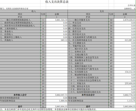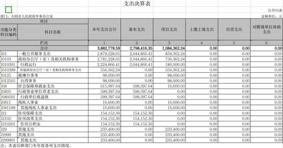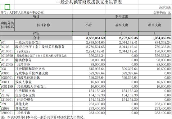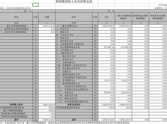 大同市人民政府外事办公室2020年初结转和结余0.19万元,本年收入388.2万元,本年支出388.28万元,使用非财政拨款结余0万元,结余分配0万元,年末结转和结余0.11万元。