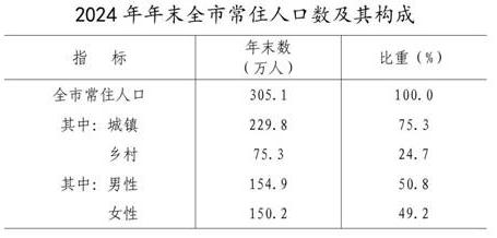 据2024年人口抽样调查,年末全市常住人口为305.1万人,比上年末减少2.8万人。其中,城镇常住人口229.8万人,占常住人口比重为75.3%,比上年末提高0.9个百分点。全年全市出生人口1.9万人,人口出生率为6.1‰;死亡人口2.5万人,死亡率为8.3‰;自然增长率为-2.2‰。