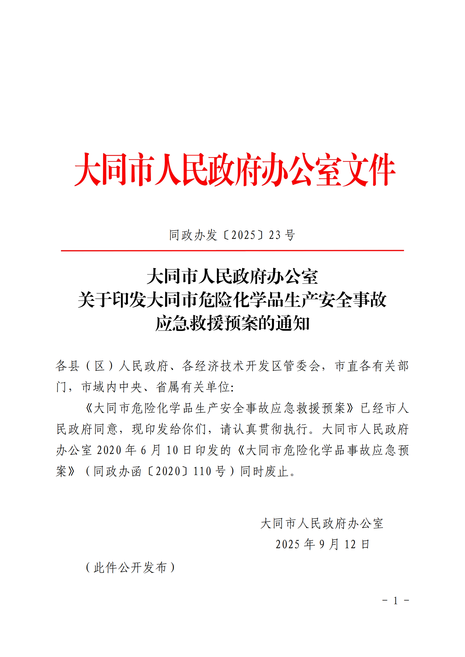 《大同市危险化学品生产安全事故应急救援预案》已经市人民政府同意,现印发给你们,请认真贯彻执行。大同市人民政府办公室2020年6月10日印发的《大同市危险化学品事故应急预案》(同政办函〔2020〕110号)同时废止。