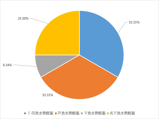 2020年9月所监测的12个断面中,水质优良(Ⅰ-Ⅲ类)的断面占比为33.33%,轻度污染(Ⅳ类)的断面占比为33.33%,中度污染(Ⅴ类)的断面占比为8.34%,重度污染(劣Ⅴ类)的断面占比为25.00%。全市总体水质呈轻度污染,主要污染物为化学需氧量。