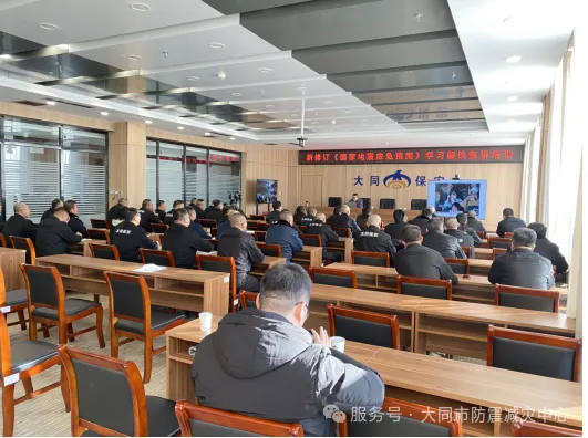 为了深入学习贯彻落实习近平总书记关于防灾减灾救灾重要论述精神,学习解读新修订《国家地震应急预案》、大力普及避险、防护、自救、互救等应急知识,提升保安公司专业人员的灾害防范意识和应急处置能力,2025年12月19日上午,大同市应急管理局、大同市防震减灾中心走进大同市保安有限公司为大同市保安公司进行了地震《国家地震应急预案》学习解读+“第一响应人”+防震减灾科普专题讲座,各分公司通过视频会议系统参加了本次培训,参训人员约500人。并通过保安公司工作微信群推送了防震减灾科普资料。