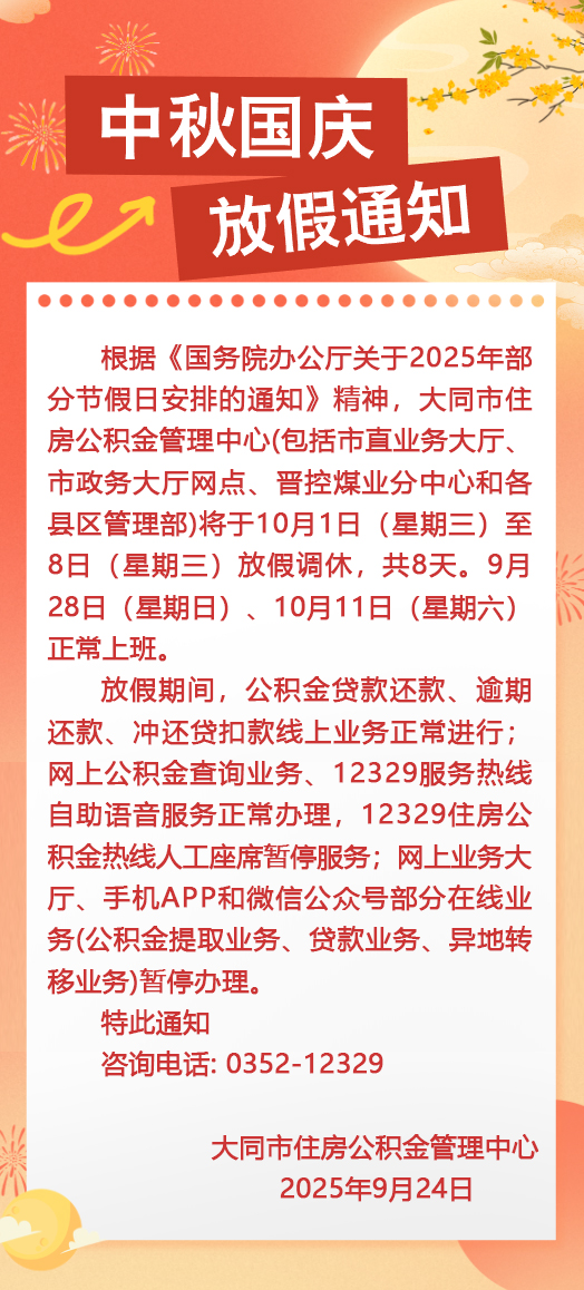 大同市住房公积金管理中心2025年中秋节、国庆节放假通知