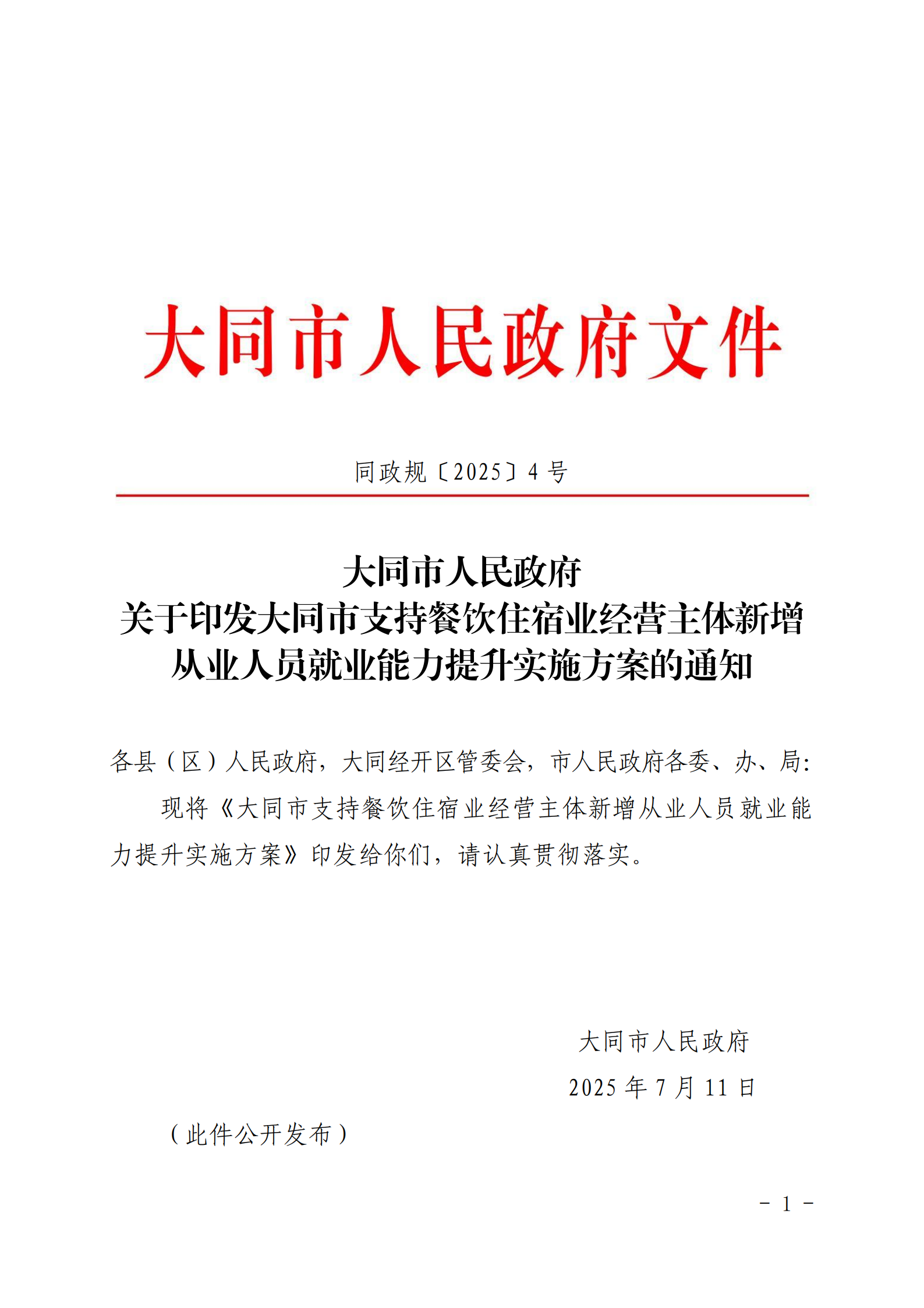 大同市人民政府关于印发大同市支持餐饮住宿业经营主体新增从业人员就业能力提升实施方案的通知