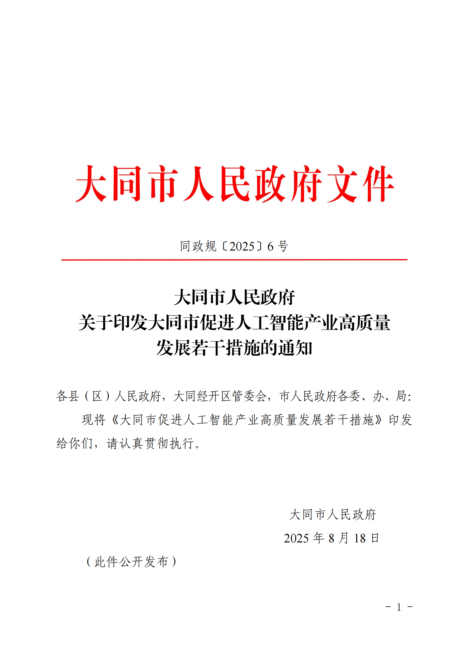 大同市人民政府关于印发大同市促进人工智能产业高质量发展若干措施的通知