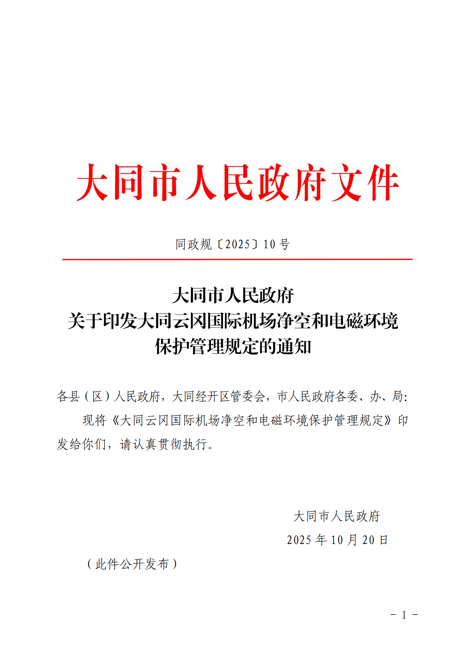 大同市人民政府关于印发大同云冈国际机场净空和电磁环境保护管理规定的通知