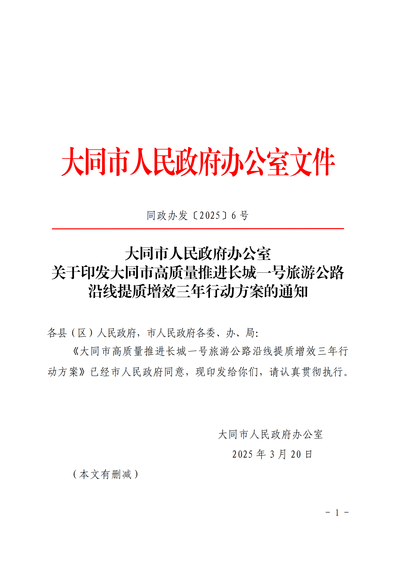 大同市人民政府办公室关于印发大同市高质量推进长城一号旅游公路沿线提质增效三年行动方案的通知