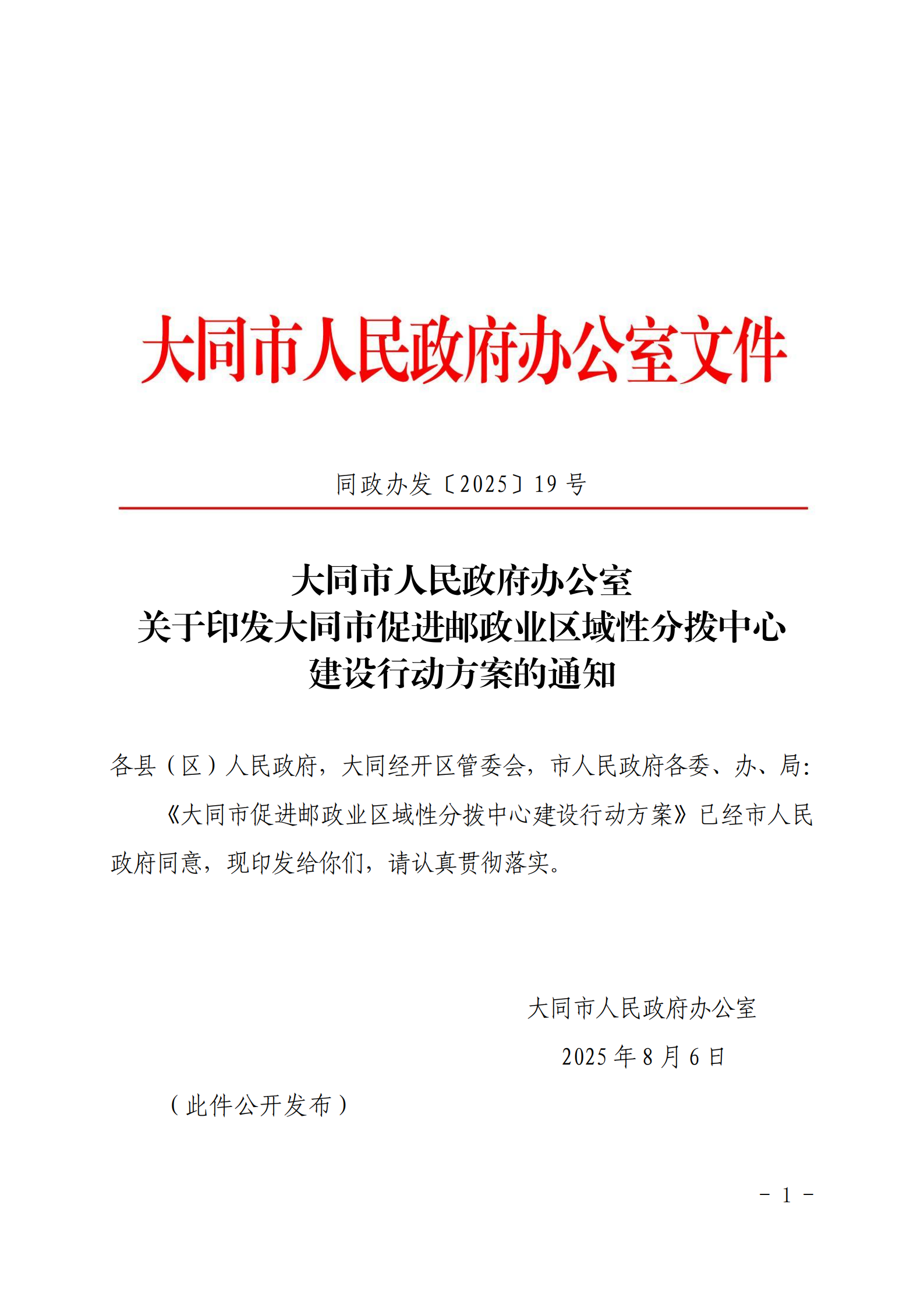 大同市人民政府办公室关于印发大同市促进邮政业区域性分拨中心建设行动方案的通知