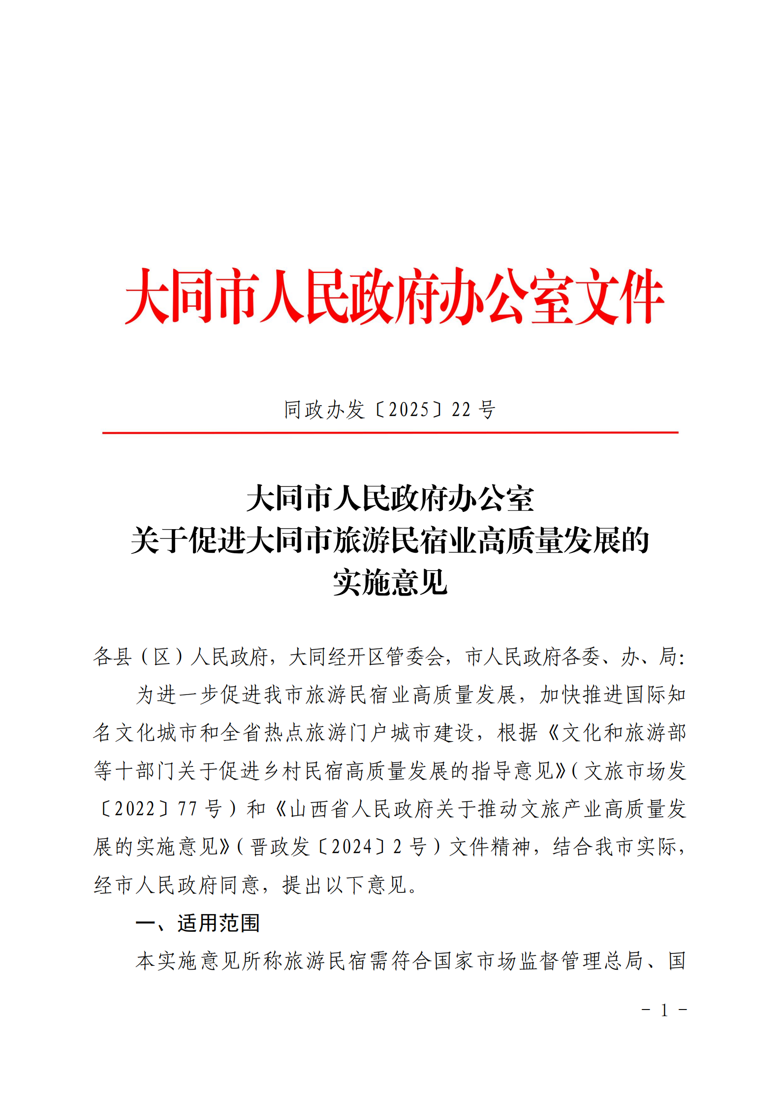 为进一步促进我市旅游民宿业高质量发展,加快推进国际知名文化城市和全省热点旅游门户城市建设,根据《文化和旅游部等十部门关于促进乡村民宿高质量发展的指导意见》(文旅市场发〔2022〕77号)和《山西省人民政府关于推动文旅产业高质量发展的实施意见》(晋政发〔2024〕2号)文件精神,结合我市实际,经市人民政府同意,提出以下意见。