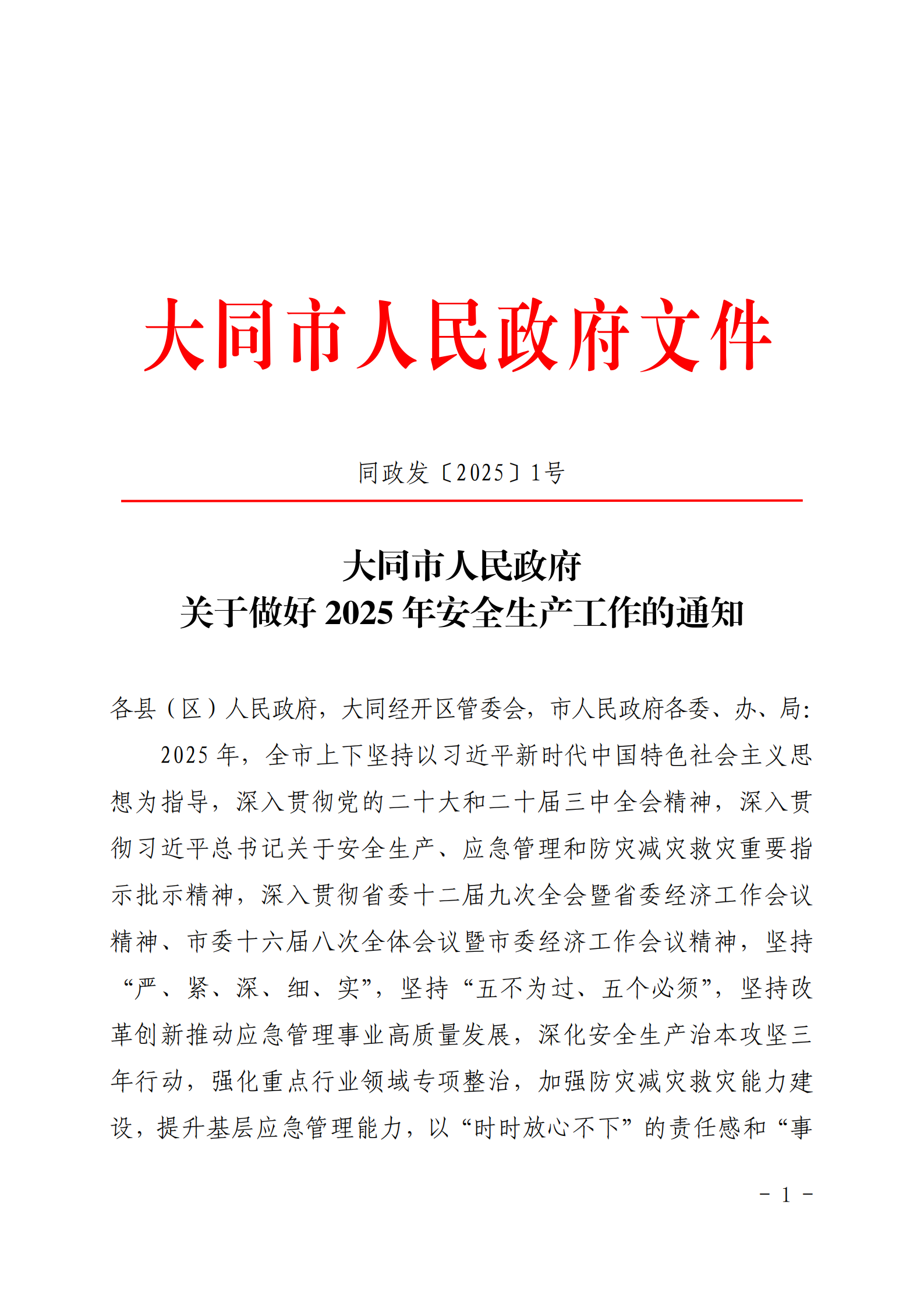 大同市人民政府关于做好2025年安全生产工作的通知