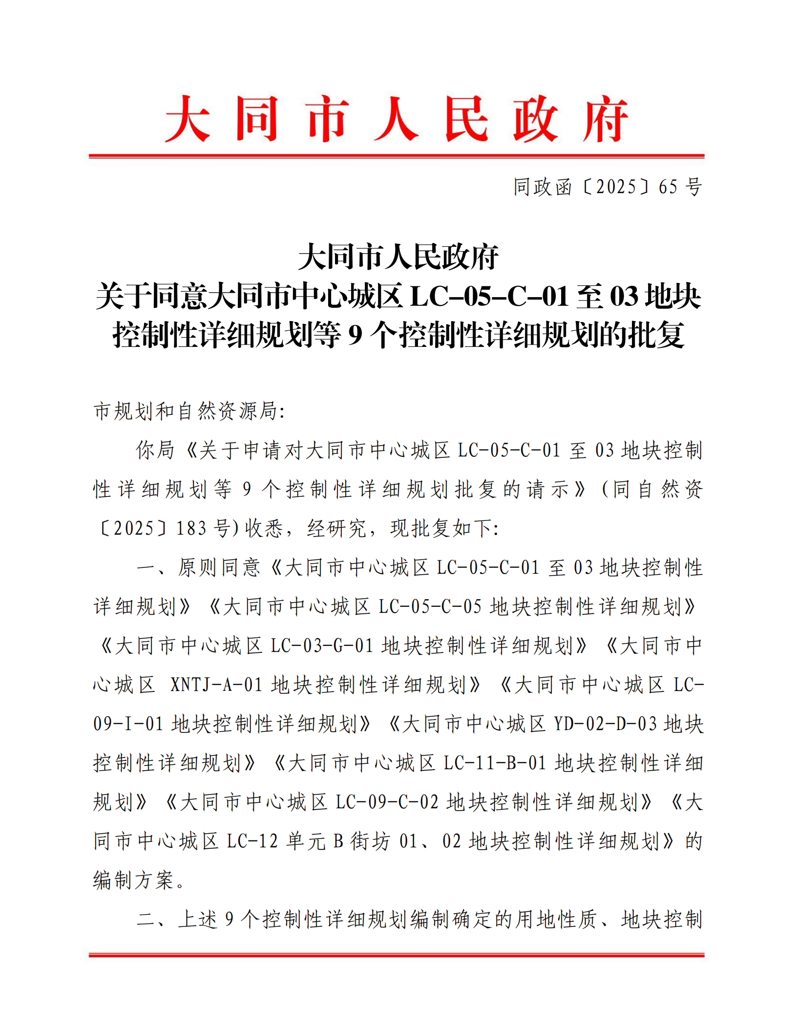 你局《关于申请对大同市中心城区LC-05-C-01至03地块控制性详细规划等9个控制性详细规划批复的请示》(同自然资〔2025〕183号)收悉,经研究,现批复如下: