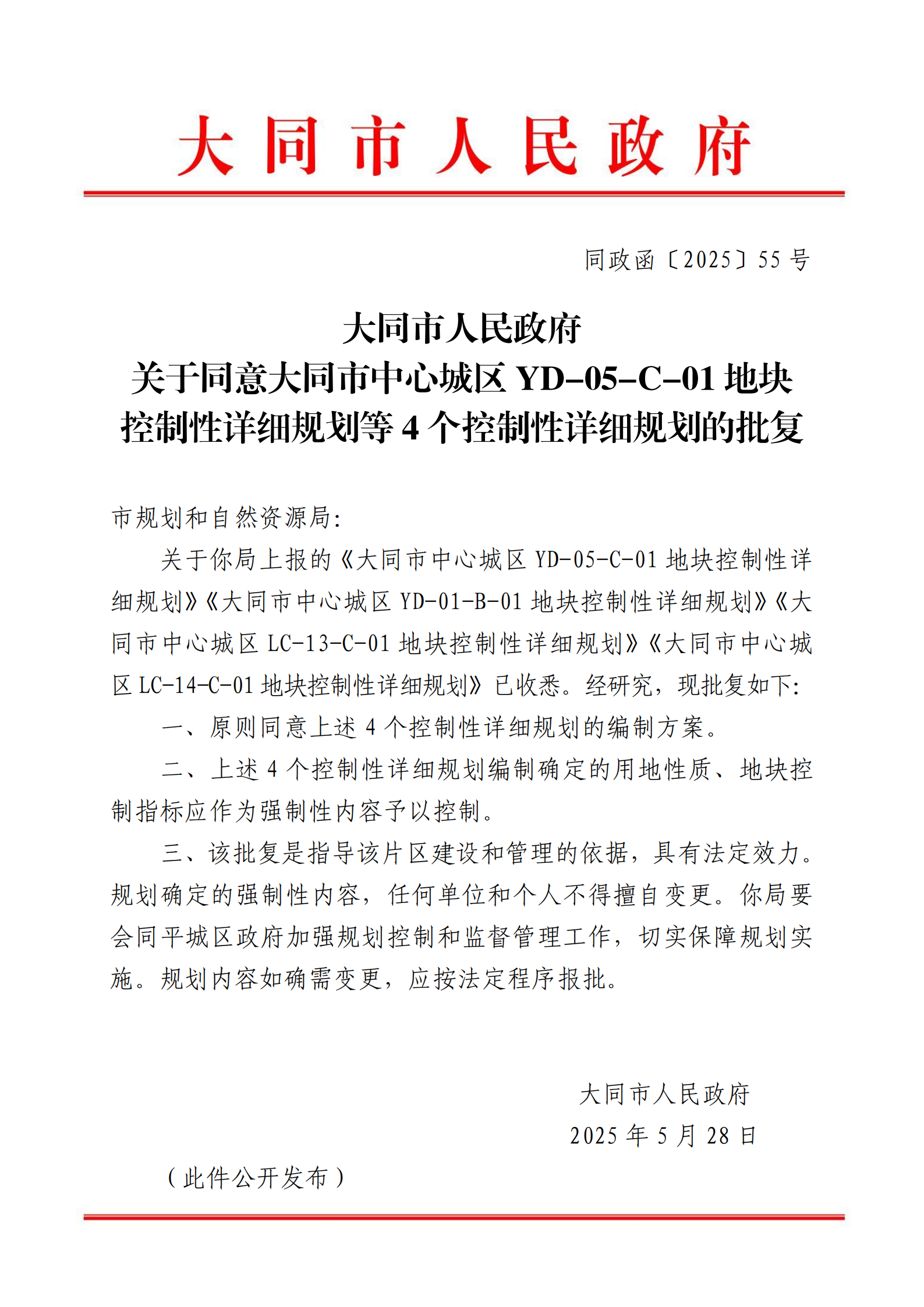 大同市人民政府关于同意大同市中心城区YD-05-C-01地块控制性详细规划等4个控制性详细规划的批复