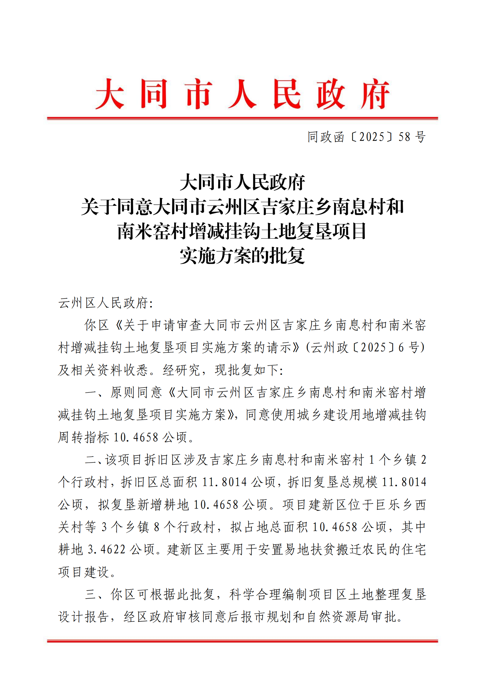 你区《关于申请审查大同市云州区吉家庄乡南息村和南米窑村增减挂钩土地复垦项目实施方案的请示》(云州政〔2025〕6号)及相关资料收悉。经研究,现批复如下: