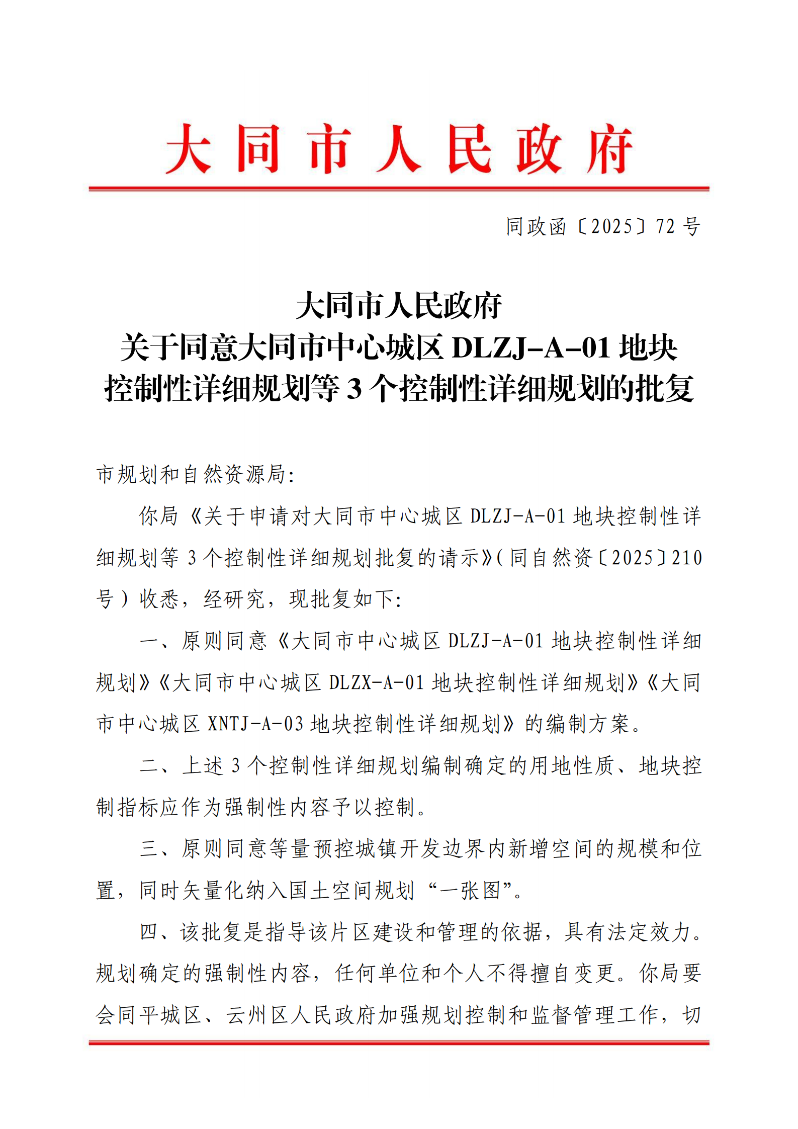 你局《关于申请对大同市中心城区DLZJ-A-01地块控制性详细规划等3个控制性详细规划批复的请示》(同自然资〔2025〕210号)收悉,经研究,现批复如下: