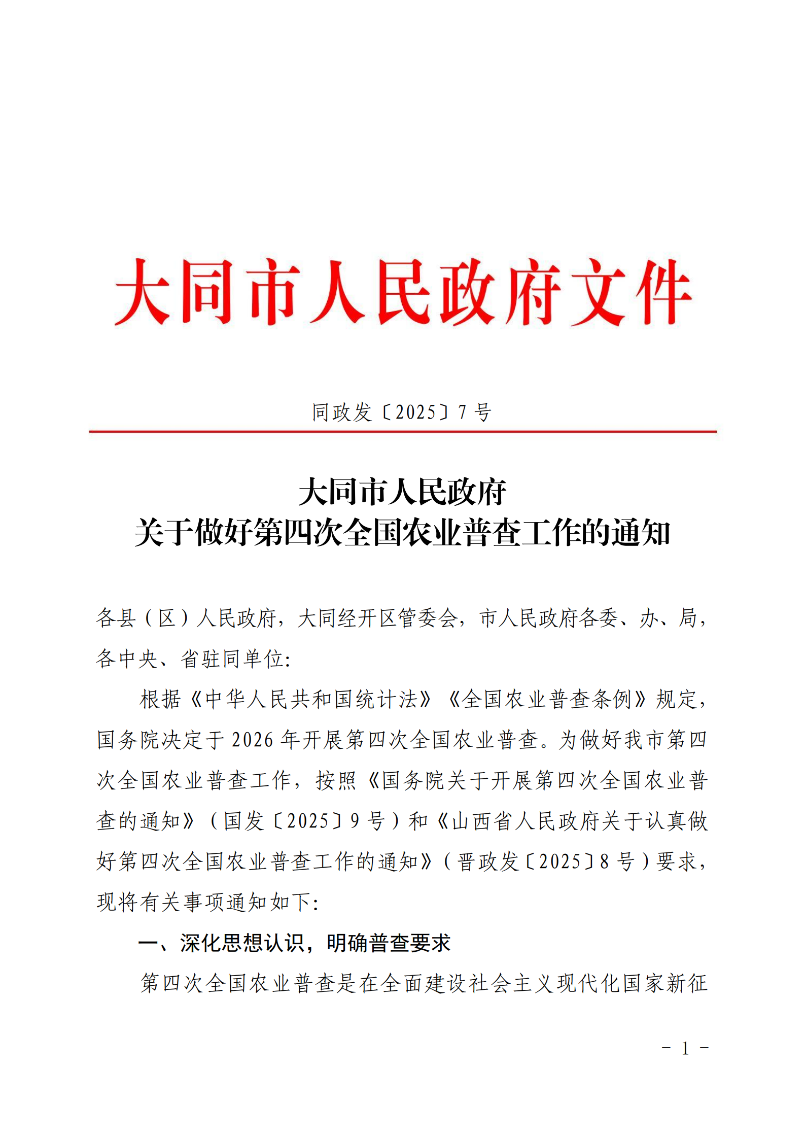 根据《中华人民共和国统计法》《全国农业普查条例》规定,国务院决定于2026年开展第四次全国农业普查。为做好我市第四次全国农业普查工作,按照《国务院关于开展第四次全国农业普查的通知》(国发〔2025〕9号)和《山西省人民政府关于认真做好第四次全国农业普查工作的通知》(晋政发〔2025〕8号)要求,现将有关事项通知如下:
