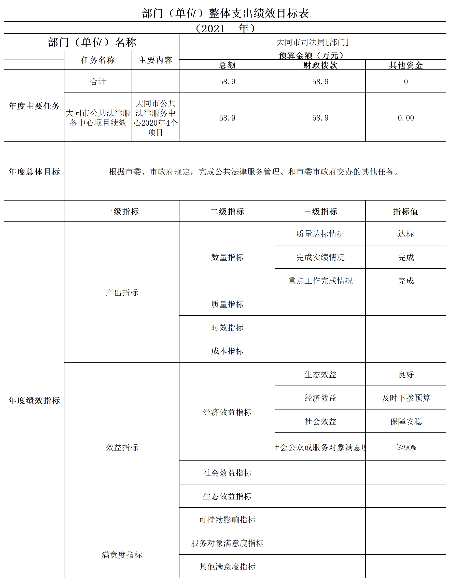 2021年大同市公共法律服务中心各项目全部进行了项目支出绩效目标申报,涉及一般公共预算当年拨款58.9万元。