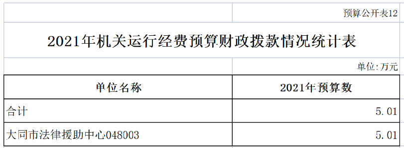 2021年大同市公共法律服务中心机关运行经费财政拨款预算5.01万元,比2020年预算增加5.01万元,增加的主要原因是事业单位改革,并入大同市法律援助中心。