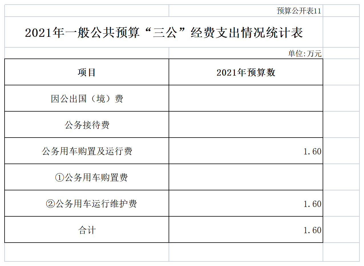 2021年一般公共预算安排的“三公”经费预算1.6万元,与2020年持平,均为公务车运行维护费,2021年因公出国(境)费无,公务接待费无。