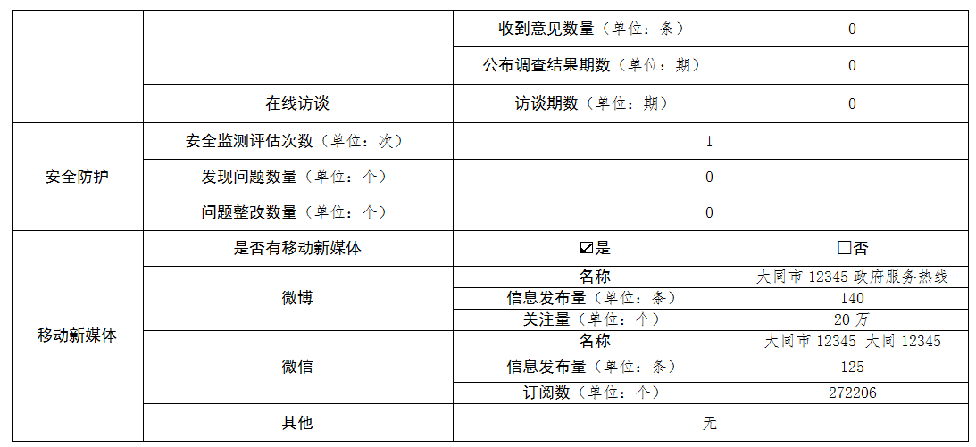 全市政府网站与政务新媒体采用第三方月度监测服务,严格按照《政府网站与政务新媒体检查指标》《中华人民共和国个人信息保护法》等文件要求,通过机器扫描、人工检查等方法,对政府网站的整体运行情况、链接可用情况、栏目更新情况、信息内容质量等进行日常巡检,常态化、多维度、全覆盖监管。针对存在问题,我们及时向主体单位反馈,要求限期完成整改,确保政府网站与政务新媒体规范合格运行。大同市政府网站集约化平台与政府系统政务新媒体本月安全运行。