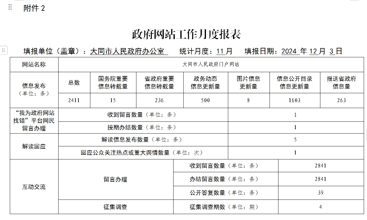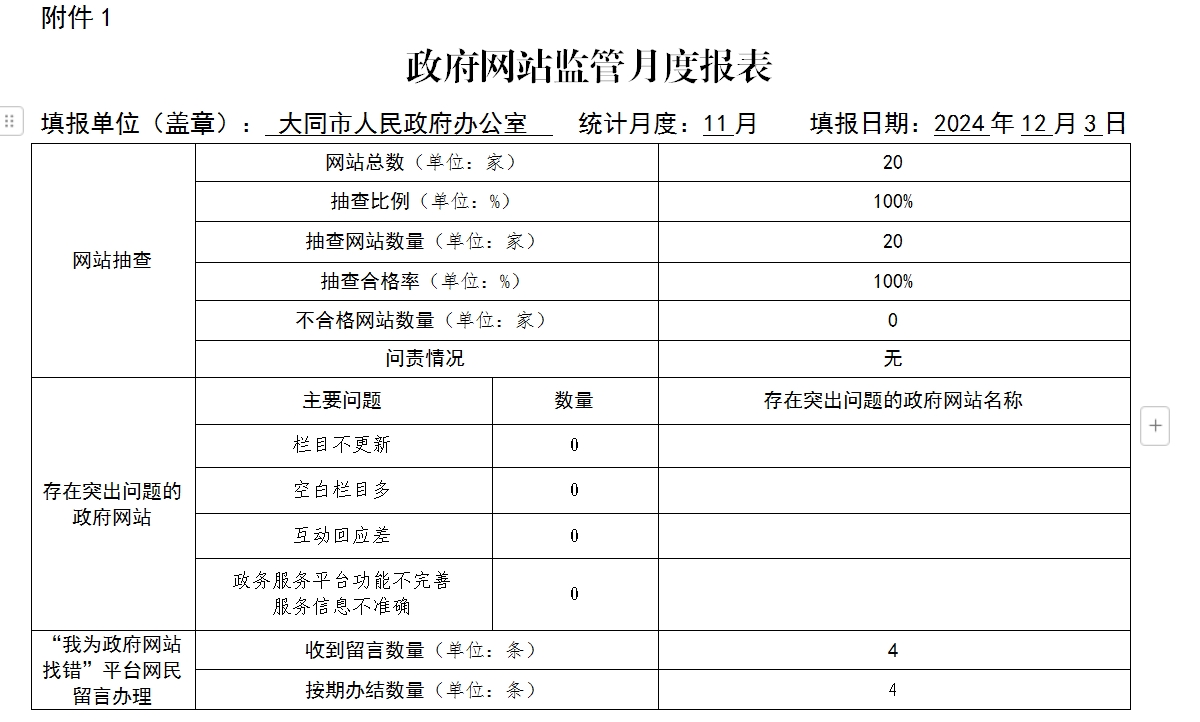 大同市人民政府办公室关于2024年11月全市政府网站与政务新媒体自查情况的报告