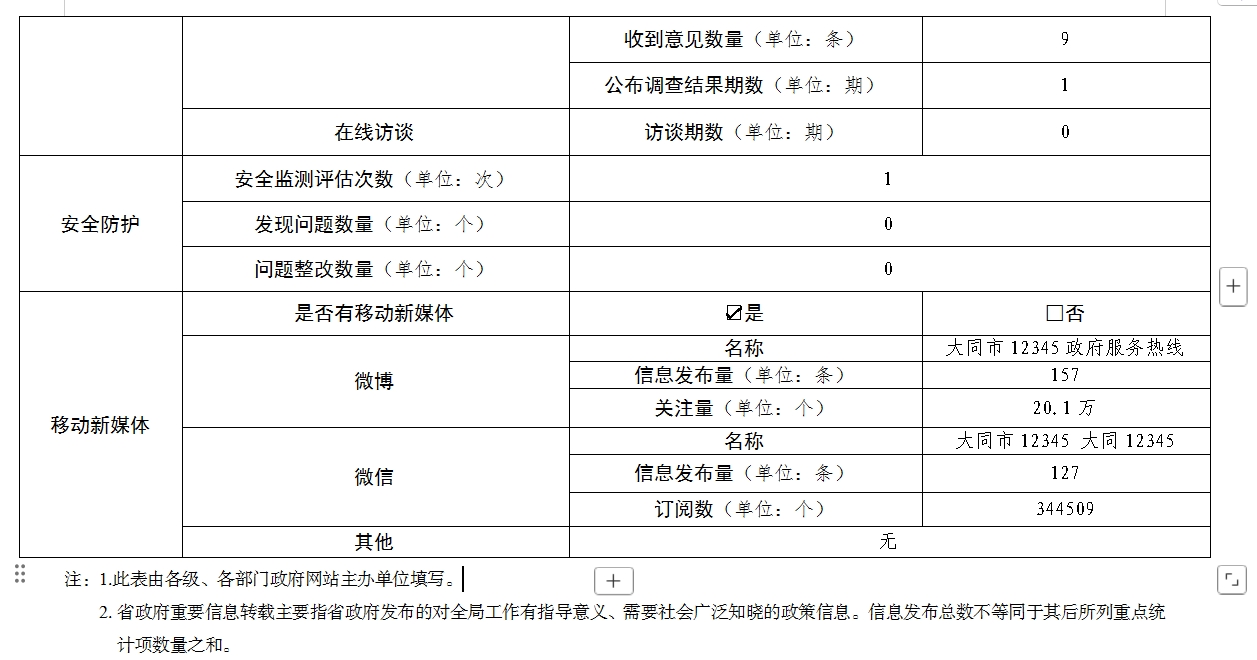 截至2025年9月30日,大同市在全国政务新媒体信息报送系统报送新媒体账号81个,其中微信公众号52个,新浪微博8个,移动客户端1个,其他20个。市直部门报送新媒体账号60个,其中微信公众号34个,新浪微博7个,移动客户端1个,其他18个。县区报送新媒体账号21个,其中微信公众号18个,新浪微博1个,其他2个。政务新媒体月度检查全覆盖,总体合格率为100%。