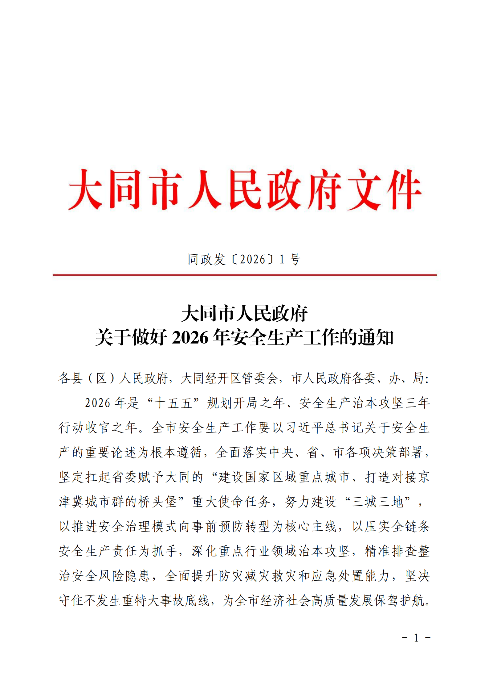 2026年是“十五五”规划开局之年、安全生产治本攻坚三年行动收官之年。全市安全生产工作要以习近平总书记关于安全生产的重要论述为根本遵循,全面落实中央、省、市各项决策部署,坚定扛起省委赋予大同的“建设国家区域重点城市、打造对接京津冀城市群的桥头堡”重大使命任务,努力建设“三城三地”,以推进安全治理模式向事前预防转型为核心主线,以压实全链条安全生产责任为抓手,深化重点行业领域治本攻坚,精准排查整治安全风险隐患,全面提升防灾减灾救灾和应急处置能力,坚决守住不发生重特大事故底线,为全市经济社会高质量发展保驾护航。
