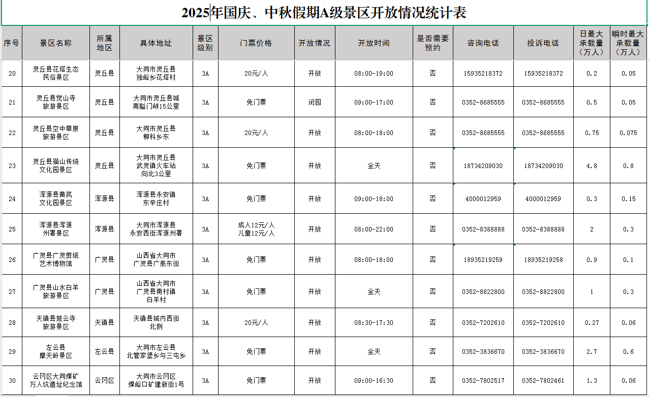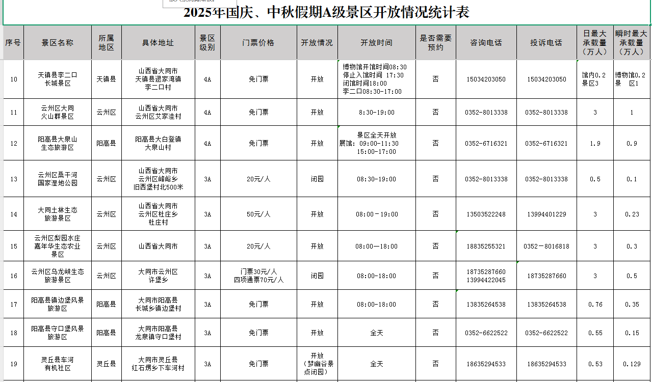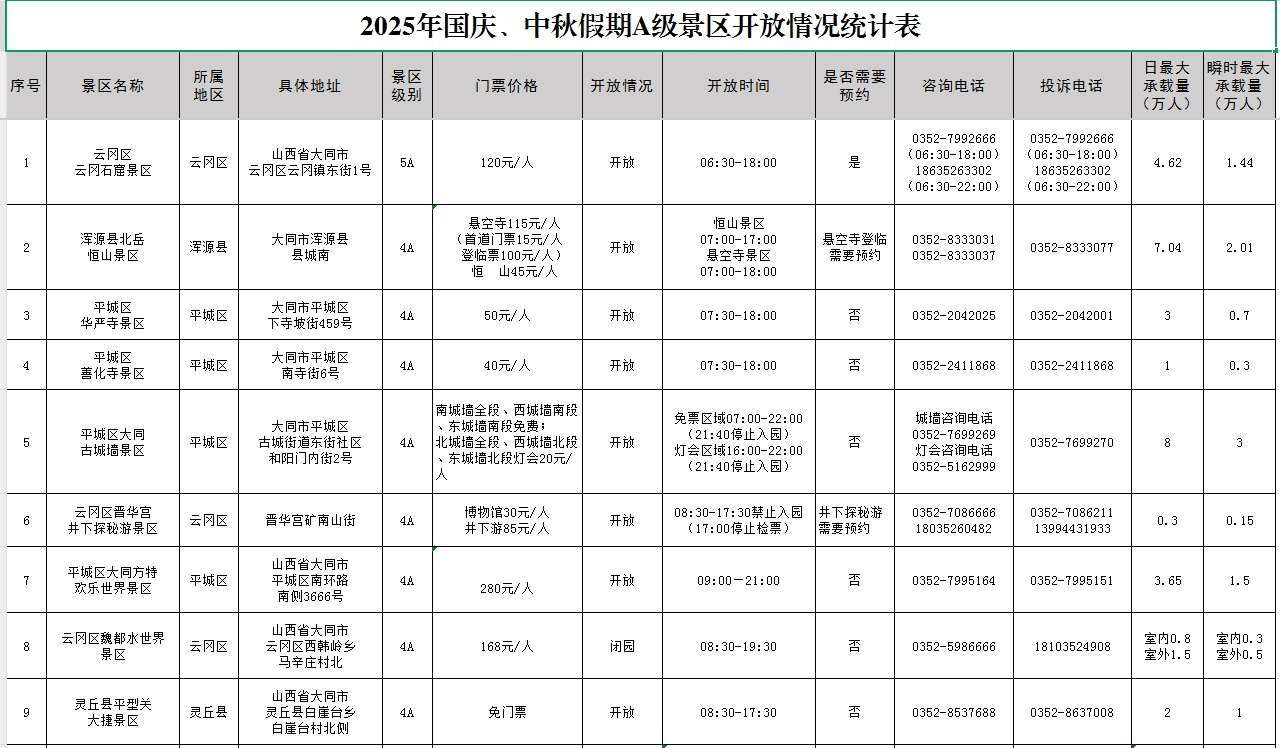 2025国庆、中秋假期A级景区开放情况统计表
