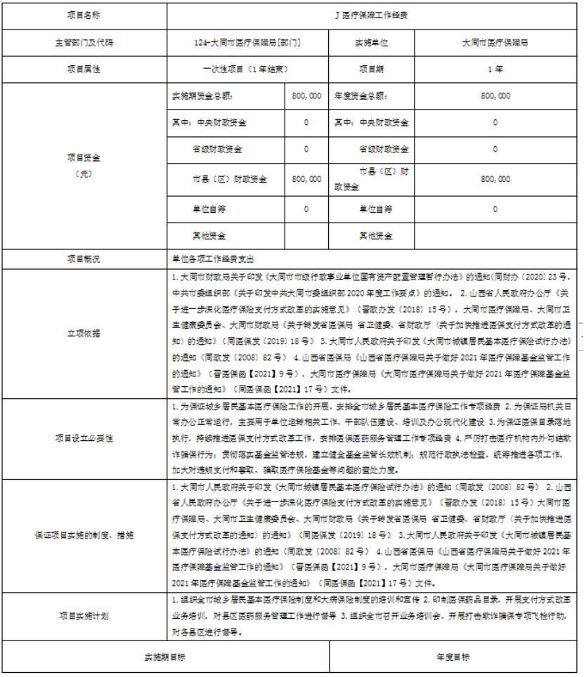 2022年,大同市医疗保障局(本级)当年申报预算的项目已全部实行绩效目标管理,均已设定绩效目标和绩效指标。项目在申报预算时同步填写《项目绩效目标申报表》,随同预算上报。