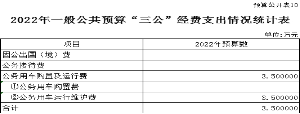 2022年一般公共预算安排的“三公”经费预算3.50万元,其中:公务用车运行维护费3.50万元,同2021年保持一致。