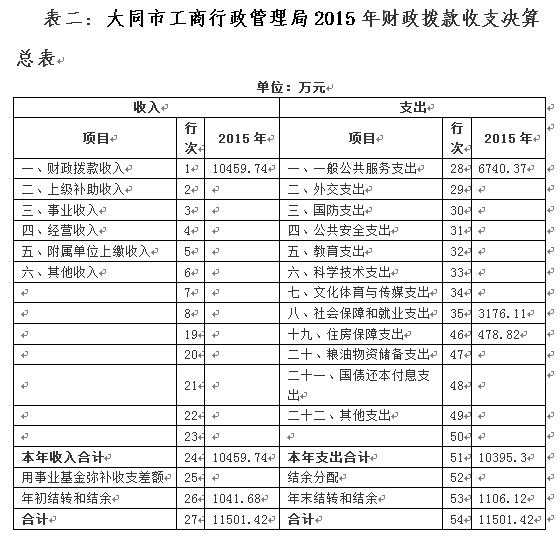 2015年部门决算报表由大同市工商行政管理局及下属单位共计23个预算单位编制上报,其中: 6个行政单位(市局、开发区分局、城区分局、南郊分局、矿区分局、新荣分局);17个事业单位(大同市个体劳动者协会、大同市民营企业协会、大同市消费者协会、大同市广告协会、大同市工商行政管理学会、大同市城区个体劳动者协会、大同市城区民营企业协会、大同市城区消费者协会、大同市南郊区个体劳动者协会、大同市南郊区民营企业协会、大同市南郊区消费者协会、大同市矿区个体劳动者协会、大同市矿区民营企业协会、大同市矿区消费者协会、大同市新荣区个体劳动者协会、大同市新荣区民营企业协会、大同市新荣区消费者协会)。