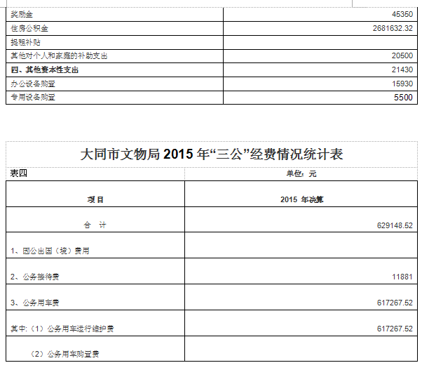 大同市文物局2015年“三公”经费总计62.92万元,其中公务接待费1.19万元,公务用车维护费61.73万元。
