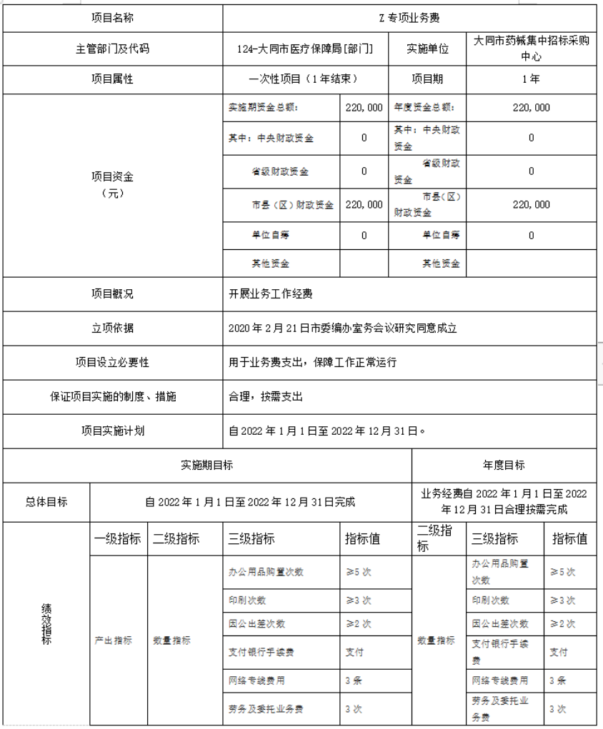 2022年,大同市医疗保障局及下属单位当年申报预算的项目已全部实行绩效目标管理,均已设定绩效目标和绩效指标。项目在申报预算时同步填写《项目绩效目标申报表》,随同预算上报。
