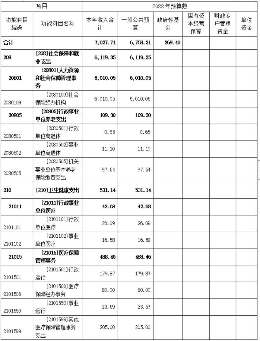 2022年,大同市医疗保障局预算收入7027.71万元,其中一般公共预算6758.31万元,政府性基金预算269.4万元。本年收入合计7027.71万元。本年支出合计7027.71万元。