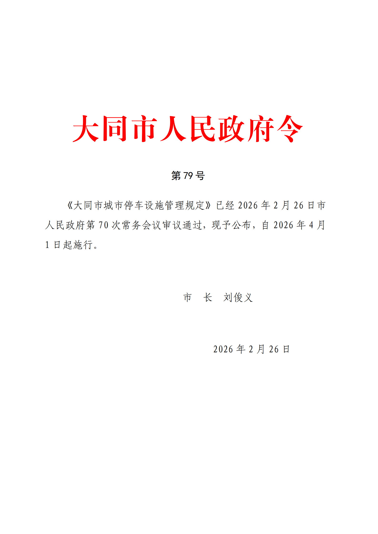 《大同市城市停车设施管理规定》已经2026年2月26日市人民政府第70次常务会议审议通过,现予公布,自2026年4月1日起施行。