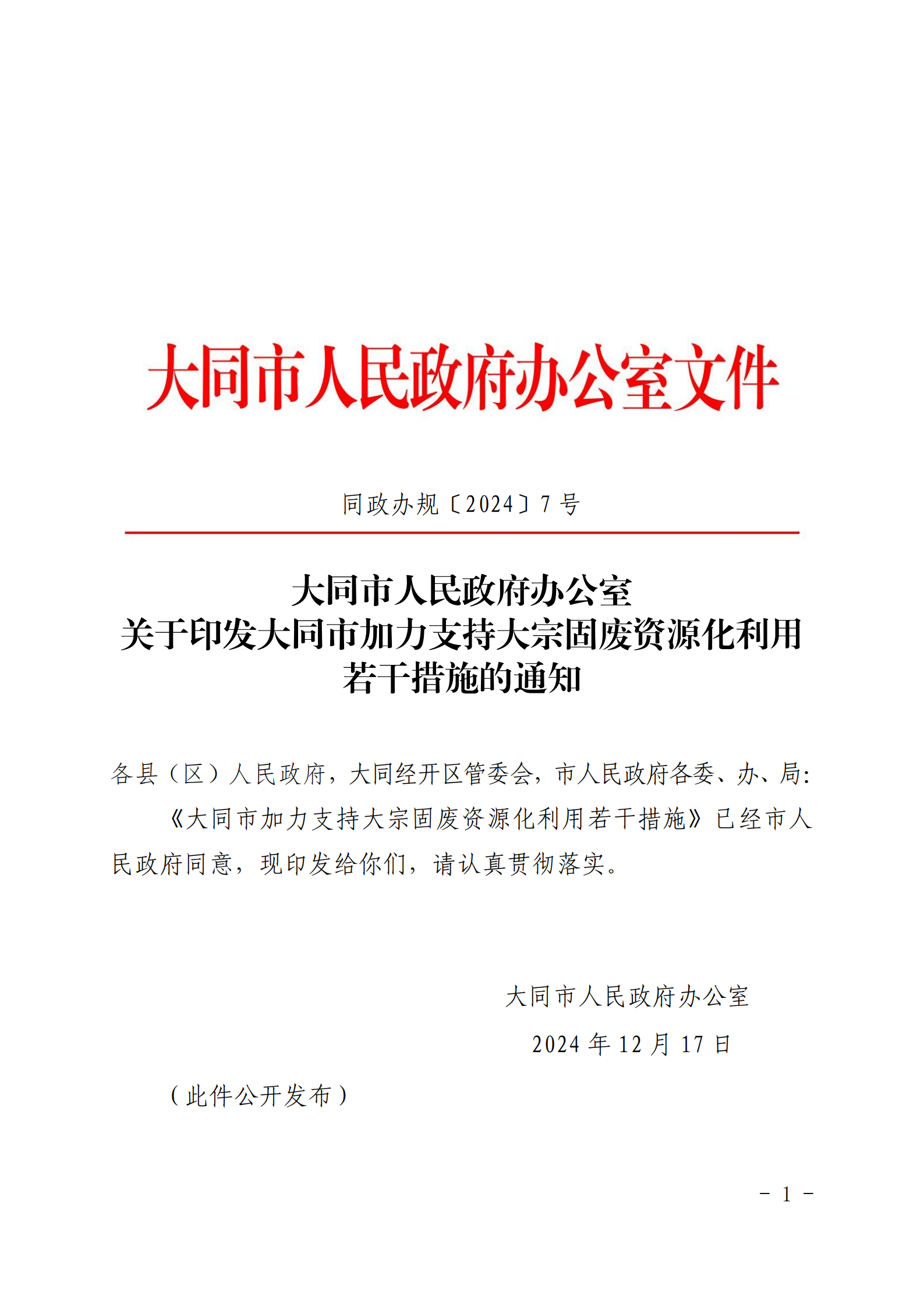 关于印发大同市加力支持大宗固废资源化利用若干措施的通知