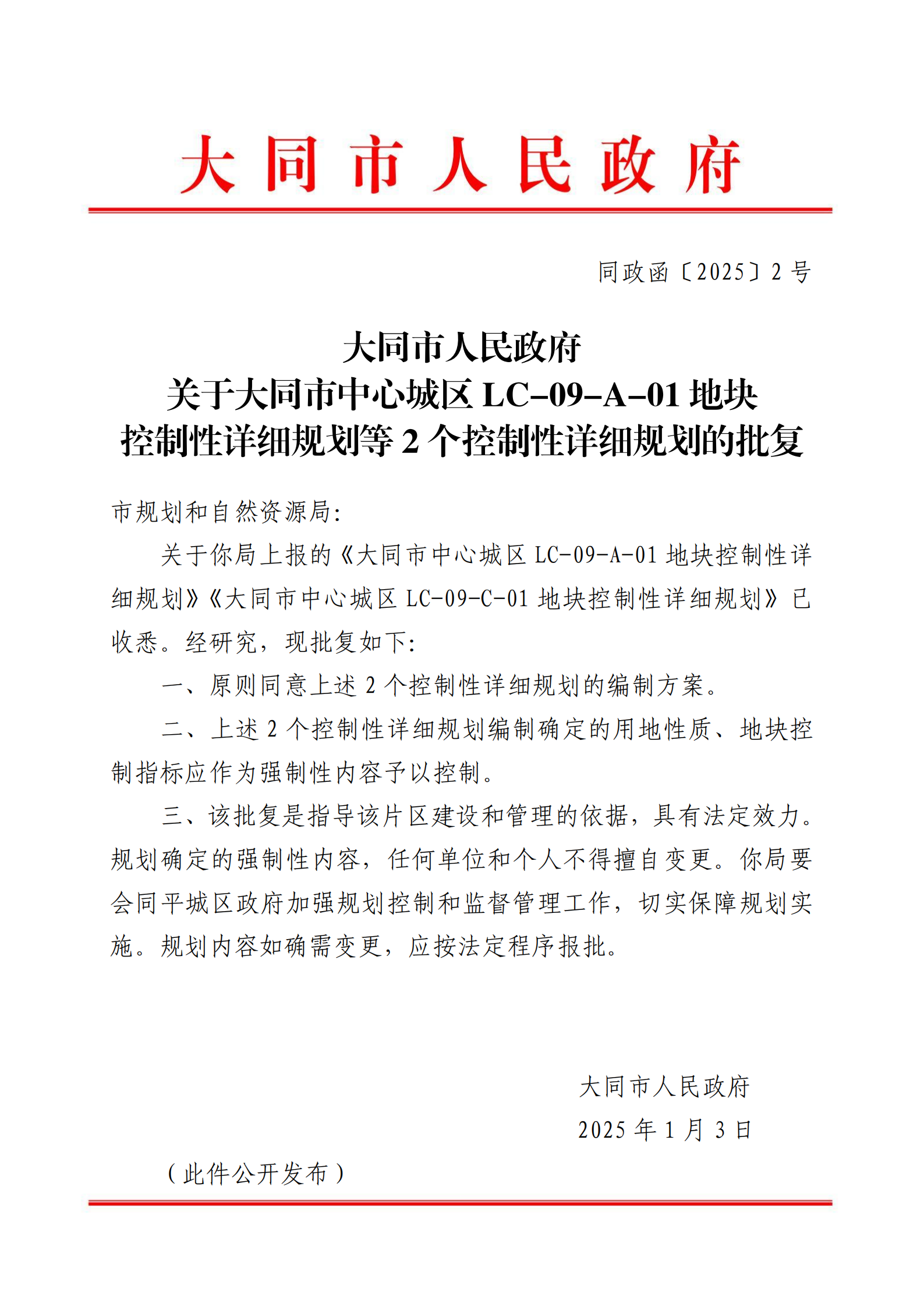 关于你局上报的《大同市中心城区LC-09-A-01地块控制性详细规划》《大同市中心城区LC-09-C-01地块控制性详细规划》已收悉。经研究,现批复如下: