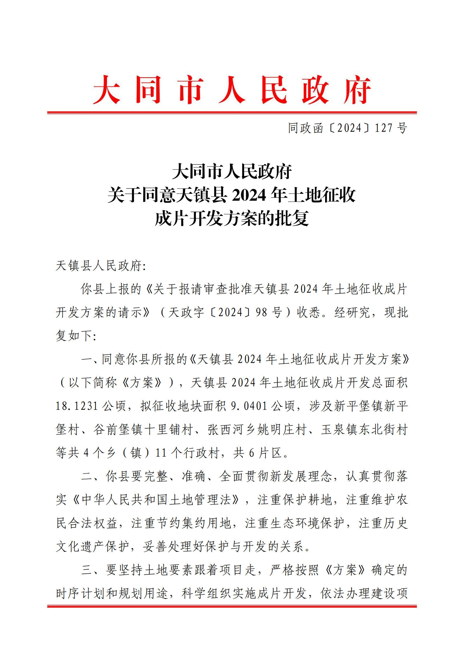 你县上报的《关于报请审查批准天镇县2024年土地征收成片开发方案的请示》(天政字〔2024〕98号)收悉。经研究,现批复如下: