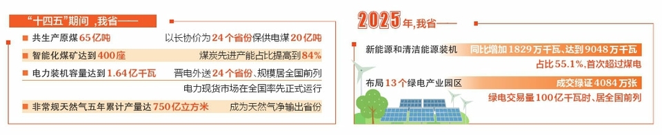 2025年,总投资超500亿元的晋北采煤沉陷区新能源基地项目全面开工。“十四五”期间,我省加快风电、光伏规模化开发步伐,配套发展氢能、甲醇等全产业链,能源供给结构更加绿色多元。2025年,我省新能源和清洁能源装机同比增加1829万千瓦、达到9048万千瓦,占比55.1%,首次超过煤电。成交绿证4084万张,绿电交易量100亿千瓦时,居全国前列。