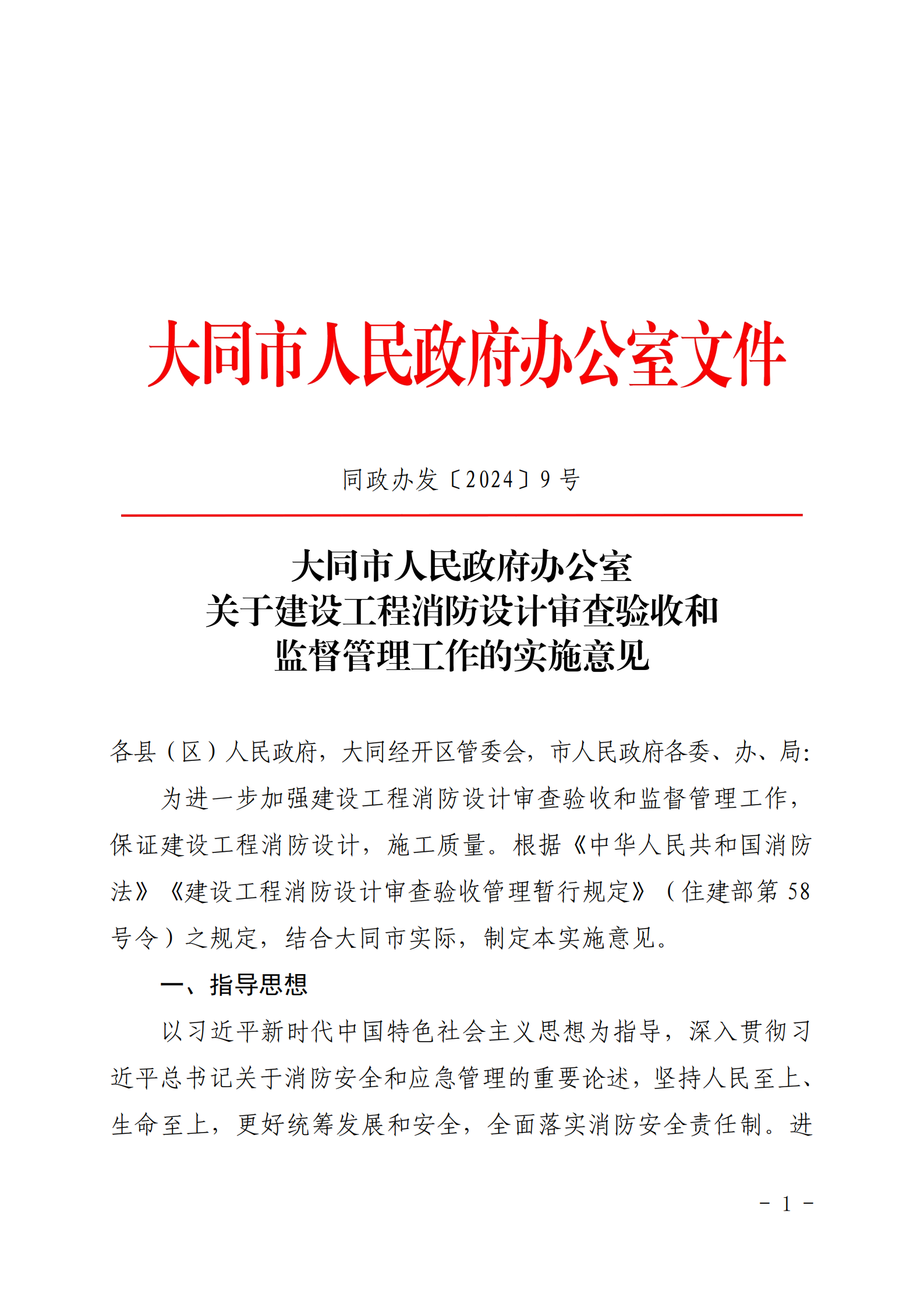 大同市人民政府办公室关于建设工程消防设计审查验收和监督管理工作的实施意见