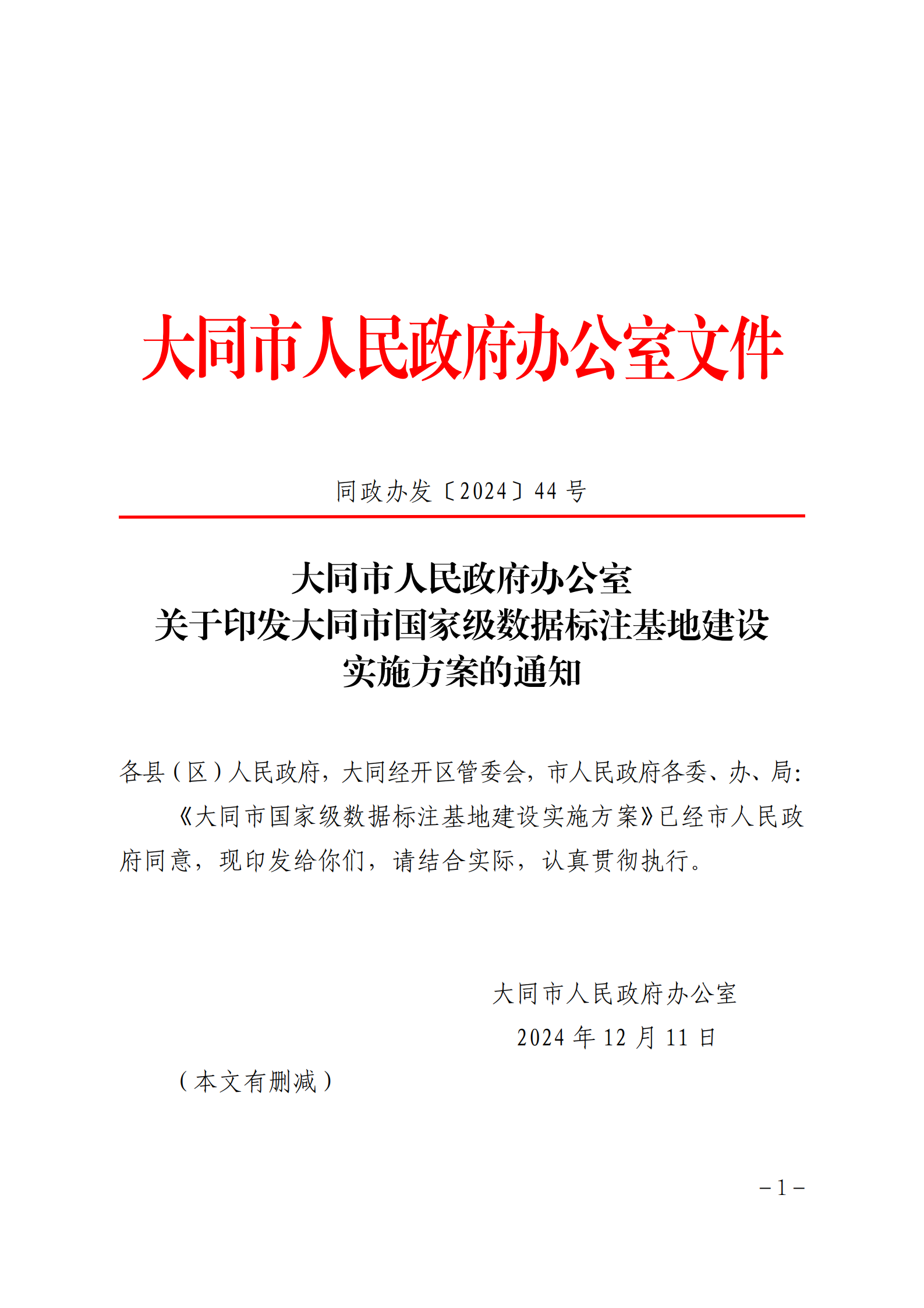 大同市人民政府办公室关于印发大同市国家级数据标注基地建设实施方案的通知
