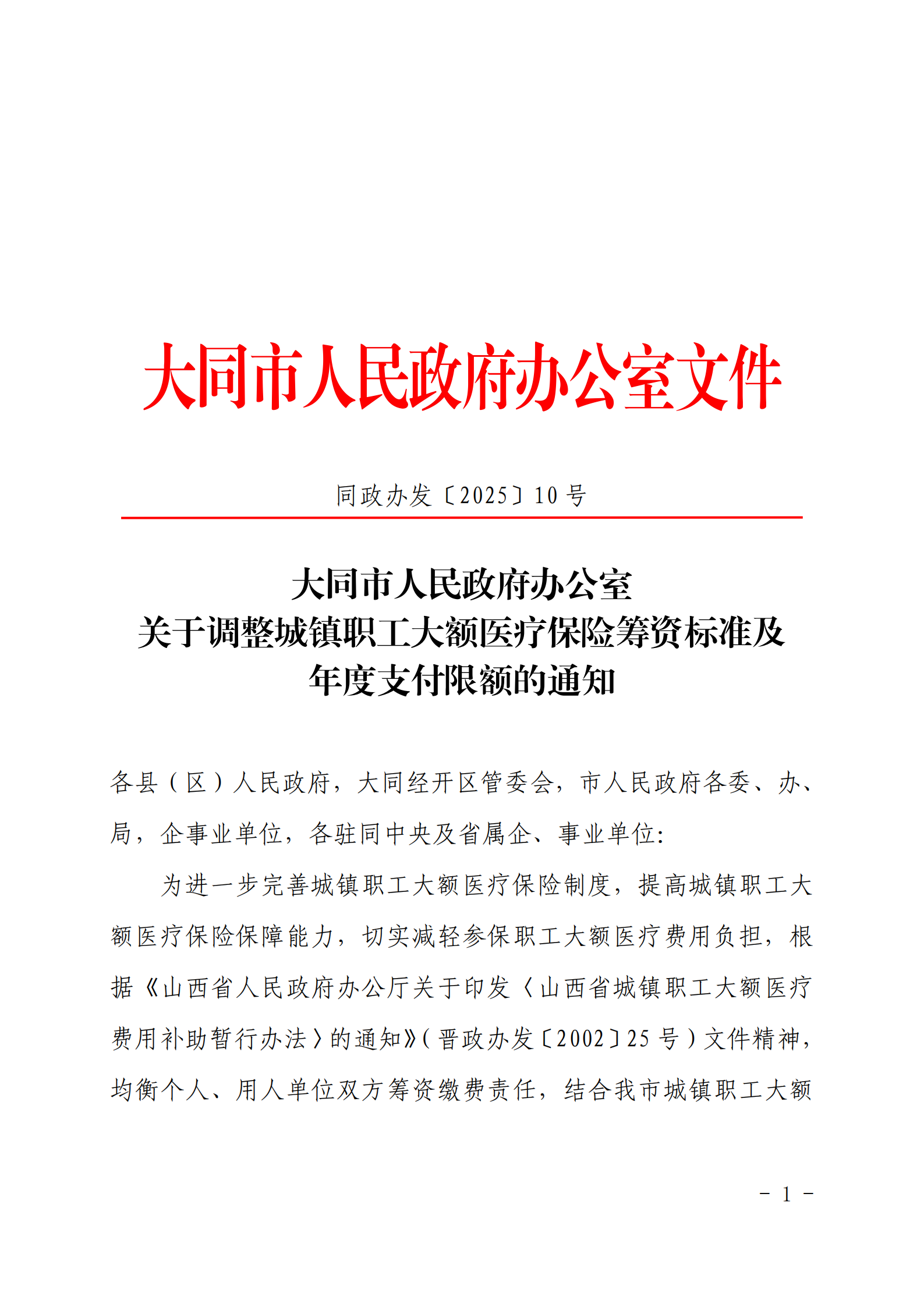 大同市人民政府办公室关于调整城镇职工大额医疗保险筹资标准及年度支付限额的通知