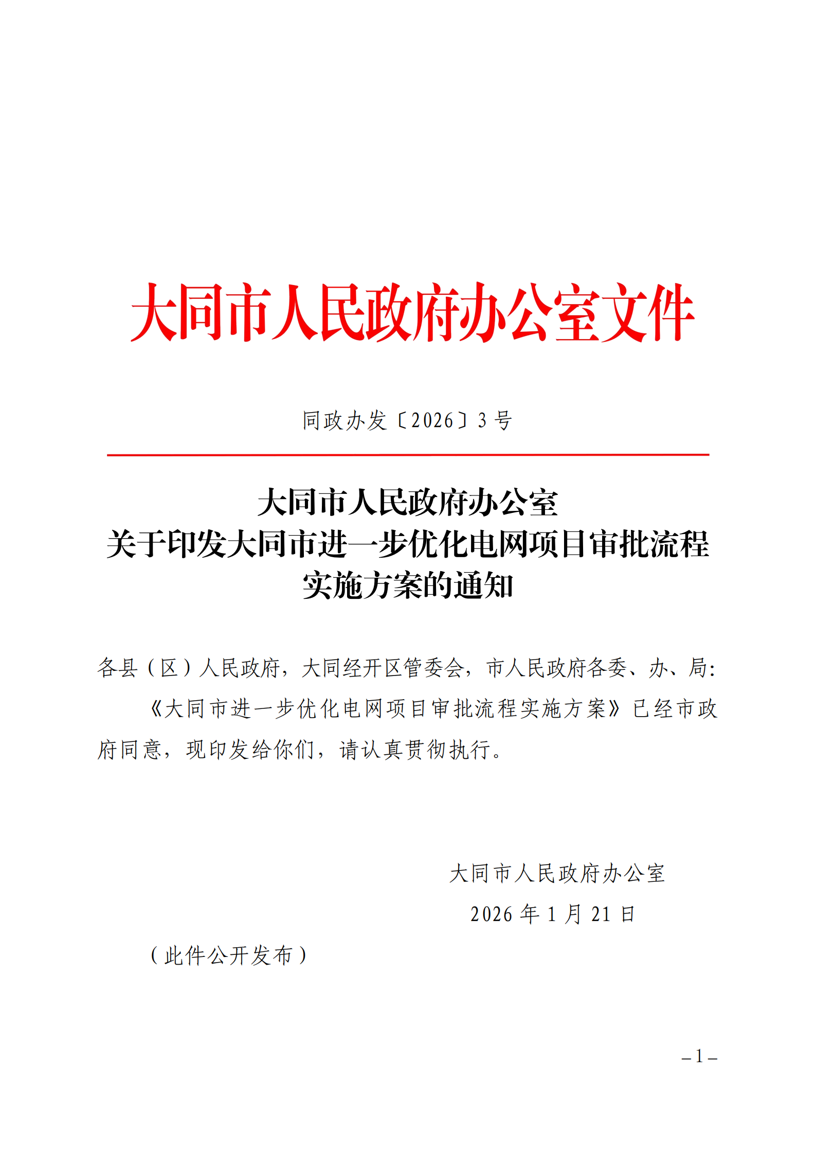 大同市人民政府办公室关于印发大同市进一步优化电网项目审批流程实施方案的通知