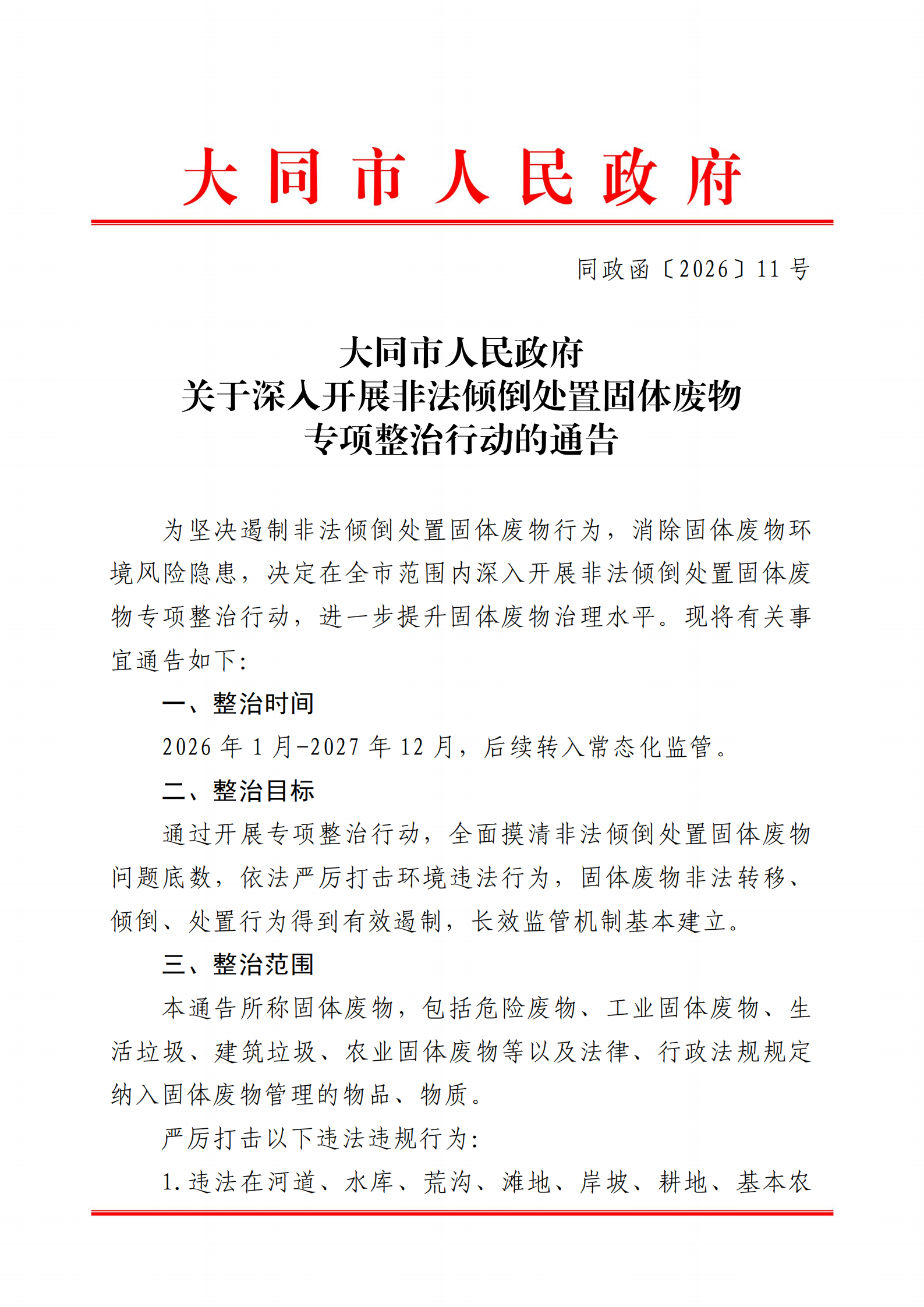 大同市人民政府关于深入开展非法倾倒处置固体废物专项整治行动的通告