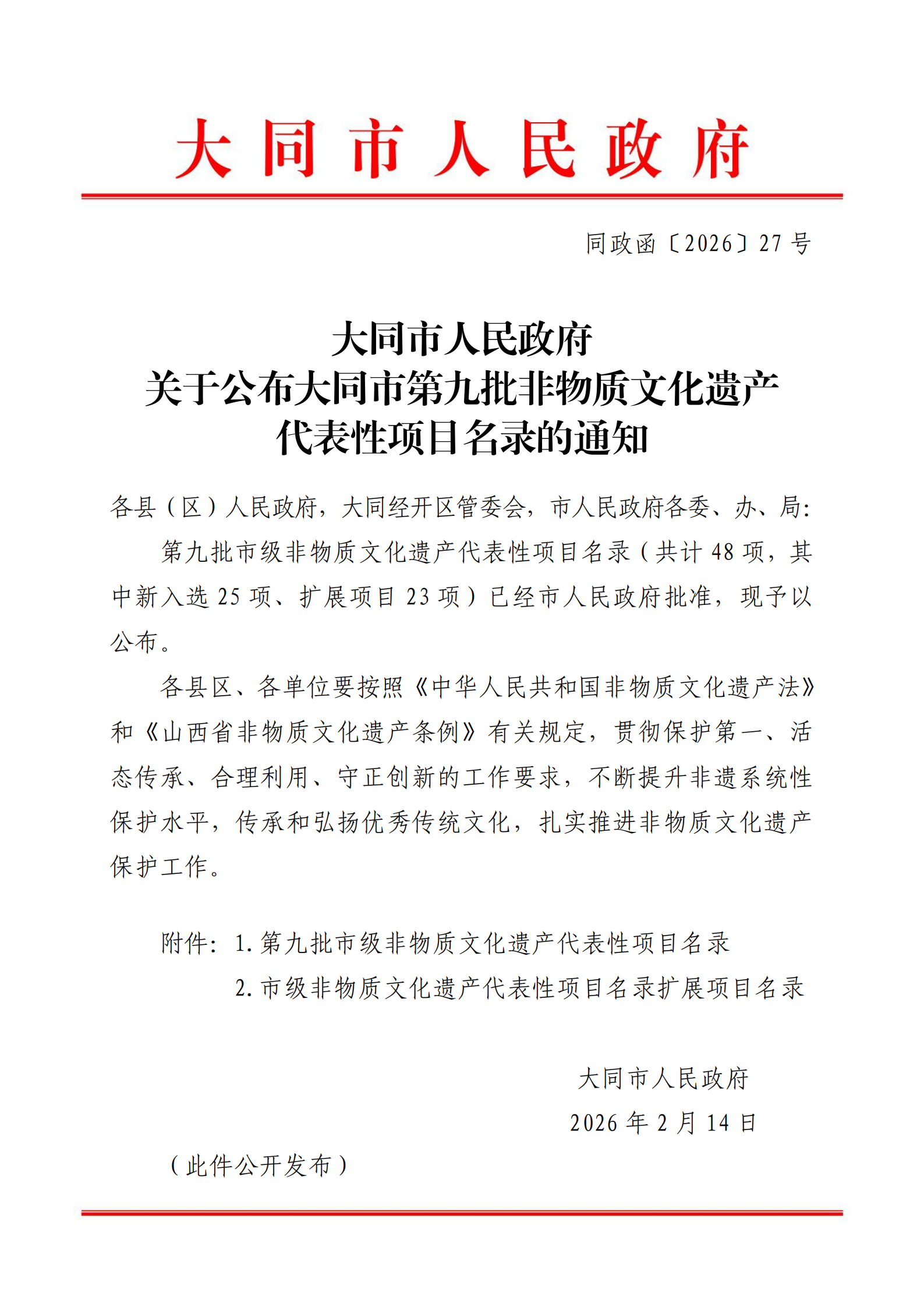 大同市人民政府关于公布大同市第九批非物质文化遗产代表性项目名录的通知