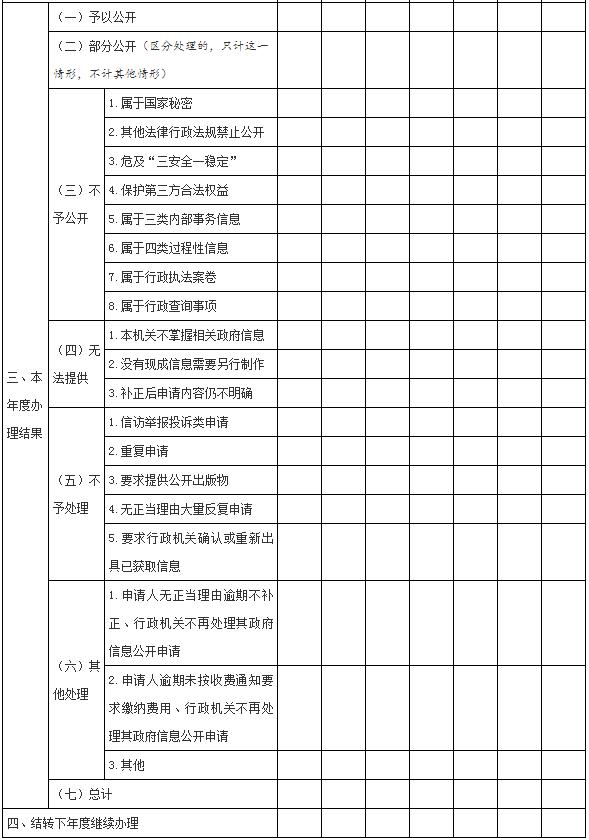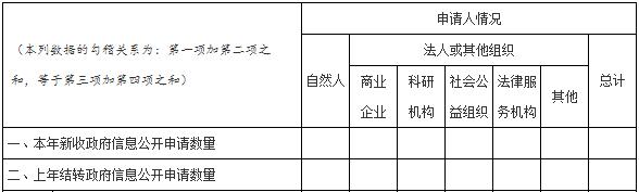 这一项主要报告两方面情况:一是申请人的类别;二是政府信息公开申请的最终处理结果。此项内容重在数据准确、要素齐备,全面客观反映政府信息公开申请接收和办理情况,便于政府信息公开工作主管部门全面掌握工作动态,使社会各界了解政府公开透明进程。