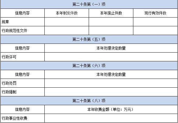 各行政机关年度报告格式模板附后。此前有关政府信息公开的各类报告和统计口径,随原政府信息公开条例的失效而失效。政府信息公开工作主管部门负责汇总的本级政府年度报告格式,参照这一格式模板办理。党的工作机关加挂行政机关牌子的单位,年度报告内容依据全国政府信息公开工作主管部门发布的有关规定(国办公开办函〔2019〕51号)确定,并参照这一格式模板办理。