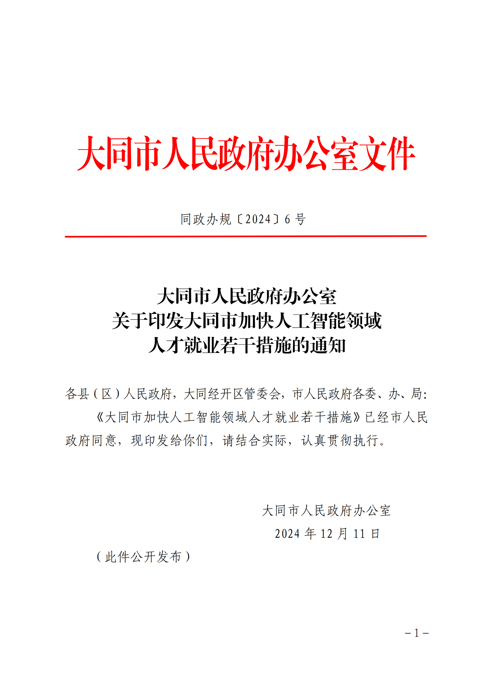 大同市人民政府办公室关于印发大同市关于加快人工智能领域人才就业的若干措施的通知
