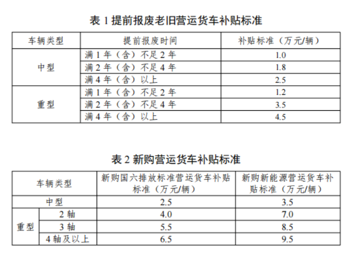 支持国三、国四排放标准营运货车报废更新,加快更新一批高标准低排放营运货车。对提前报废老旧营运货车、提前报废并更新购置国六排放标准货车或新能源货车、仅新购符合条件的新能源货车,按照报废车辆类型、提前报废时间和新购置车辆动力类型等,实施差别化补贴标准(见附件)。已获得中央其他资金渠道支持的车辆,不纳入本次补贴资金支持范围。上述补贴政策实施期限为2025年1月1日至2025年12月31日。