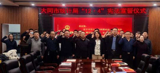 二是提前筹划,充分准备。2025年12月4日是第十二个国家宪法日,大同市统计局积极派员参加“12·4”宪法宣传日现场宣传活动。通过发放统计法宣传海报、宣传折页纸,发放牙线、纸巾、手提袋、优盘等法治宣传品,结合“一对一”为社会公众讲解《统计法》新修改的内容与亮点等方式,增加了社会公众对《统计法》的知晓度。现场氛围热烈,市局法治宣传品受到群众喜爱。12月5日,市局党组理论学习中心组围绕宪法知识和统计法律法规开展学习,组织开展宪法宣誓仪式,市局党组书记、局长吴钧同志带领局党组理论学习中心组全体人员及2025年新入职职工共计50余人参加宪法宣誓。组织收看国家统计局举办的宪法专题讲座,市局各科室党员干部、业务骨干、法规科全体成员,各县(区)统计局工作人员参会。