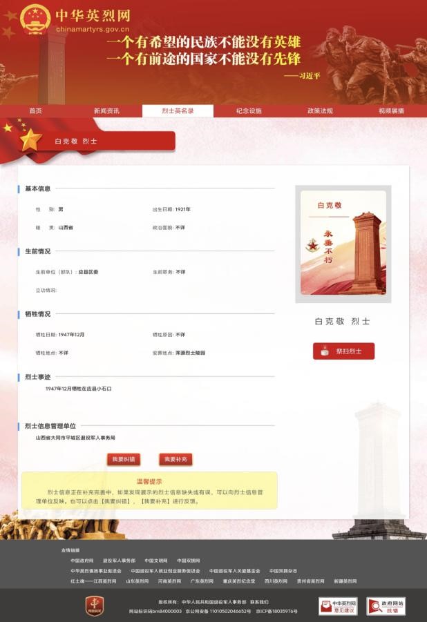 第一步:在浏览器输入网址:www.chinamartyrs.gov.cn(中华英烈网)或扫描下方二维码进入。