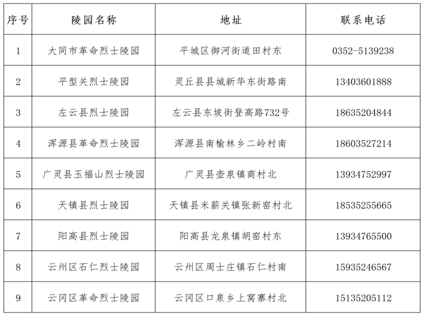我市各级烈士陵园地址及联系电话
